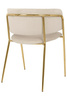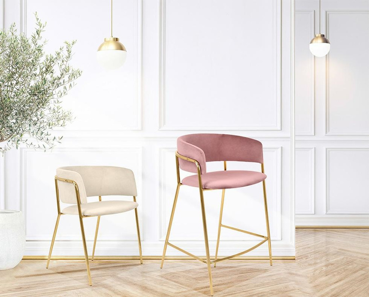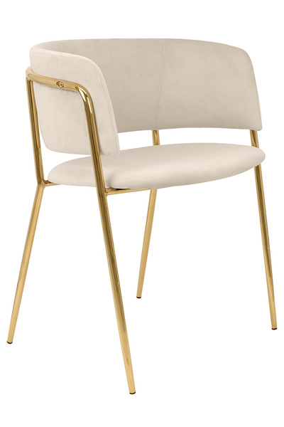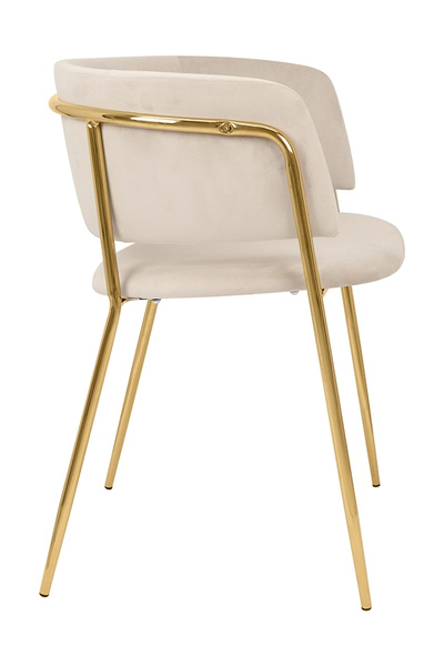 Siedzisko i oparcie tapicerowane są miękkim i przyjemnym w dotyku welurem. Mocna, stabilna konstrukcja została wykonana z metalu w złotym, błyszczącym kolorze.