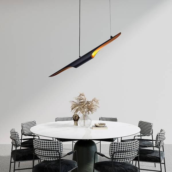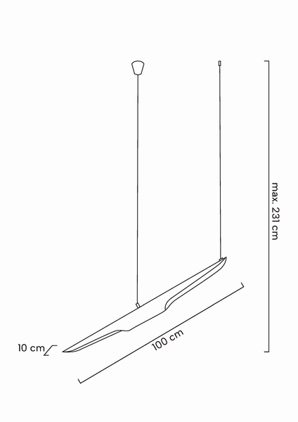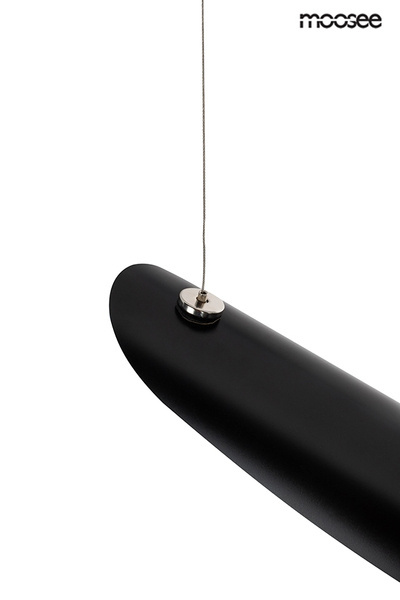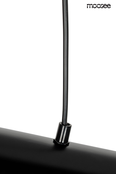 Lampa wisząca CONTEO od marki MOOSEE. Wykonana z formowanego aluminium w czarnym, matowym kolorze. Wewnętrzna strona klosza w złotym kolorze, doskonale rozprasza i “ogrzewa” światło. Całość jest zawieszona w charakterystyczny sposób na czarnej podsufitce, przewodzie w oplocie i stalowej lince. Conteo z powodzeniem może zawisnąć nad stołem w jadalni, barem lub recepcją w hotelu. Światło: 2 x E27 max. 40 W (brak w zestawie) Oprawa: wys. 231 cm / szer. 100 cm / gł. 10 cm Klosz: dł. 100 cm / śr. 8 cm Mocowanie: śr. 10 cm / wys. 11 cm Element mocowania linek do sufitu: wys. 3,5 cm / śr. 1,5 cm Przewód: 170 cm Montaż: instalacja sufitowa Waga netto: 1,5 kg Wymiary opakowania: 107 cm / 23 cm / 17 cm.