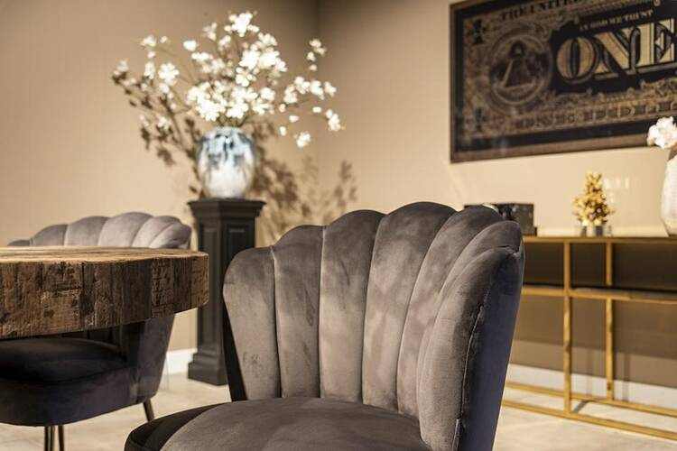 Krzesło Pippa marki Richmond Interiors jest tapicerowane welurem (100% poliester) w odcieniu szarym/ stone.