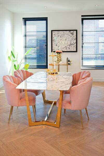 Krzesło Pippa marki Richmond Interiors jest tapicerowane welurem (100% poliester) w odcieniu różowym.