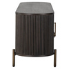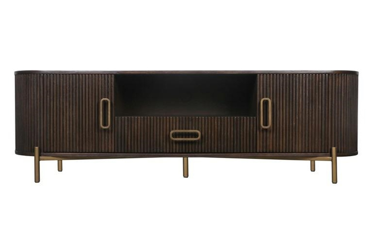 Szafka RTV Luxor jest szczególnie wyjątkowa dzięki eleganckim lamelom połączonym z drewnem dębowym oraz metalowymi złotymi uchwytami.