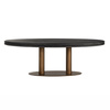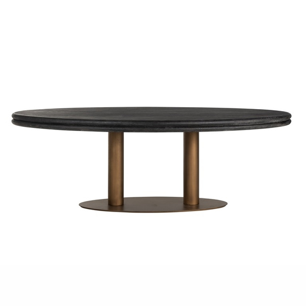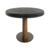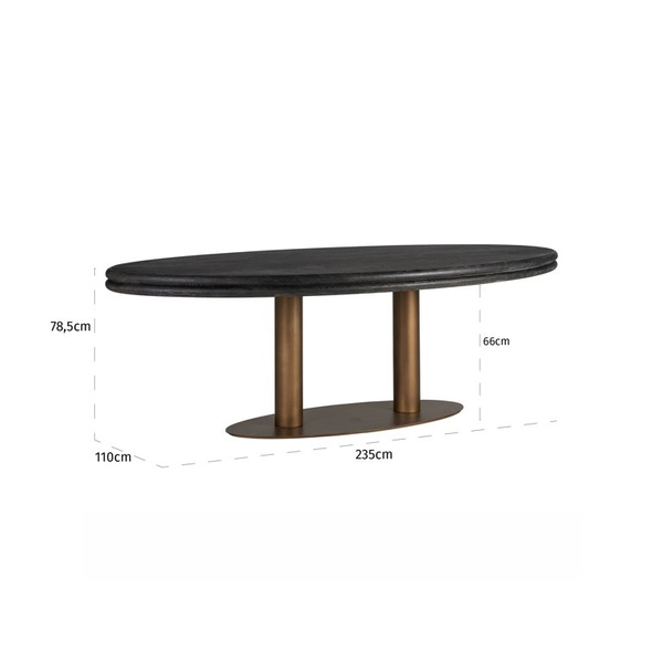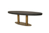 Ten wystawny stół jadalniany został stworzony przy użyciu metalu w kolorze postarzanego mosiądzu i ciemnobrązowego wykończenia.