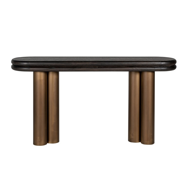 Podwójne dębowe rustykalne czarne blaty spoczywają na solidnych metalowych nogach, pięknie wykończonych w kolorze mosiądzu.