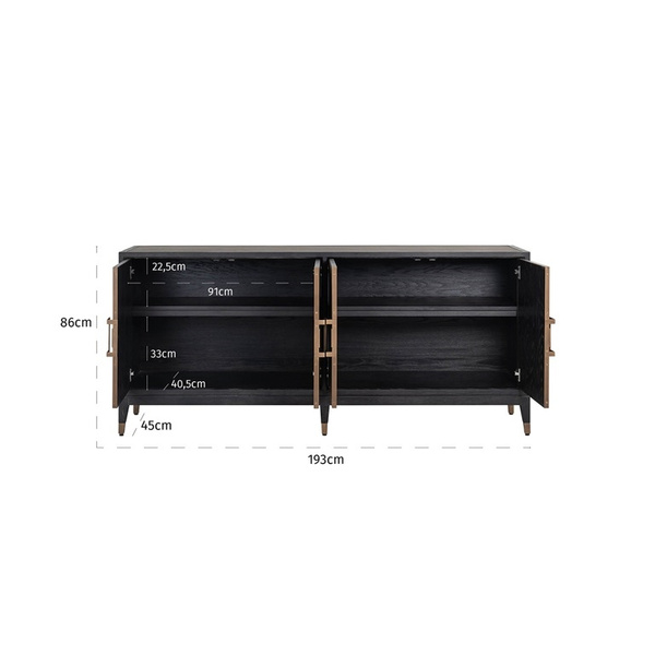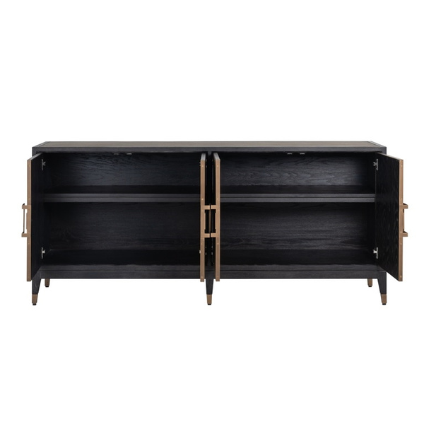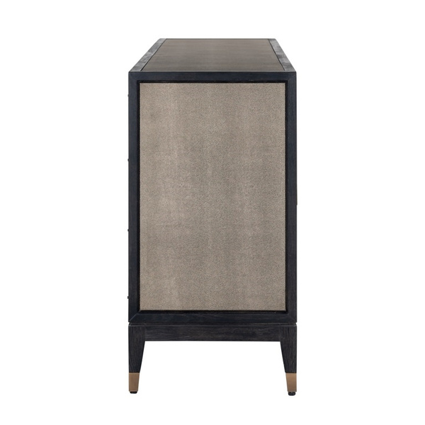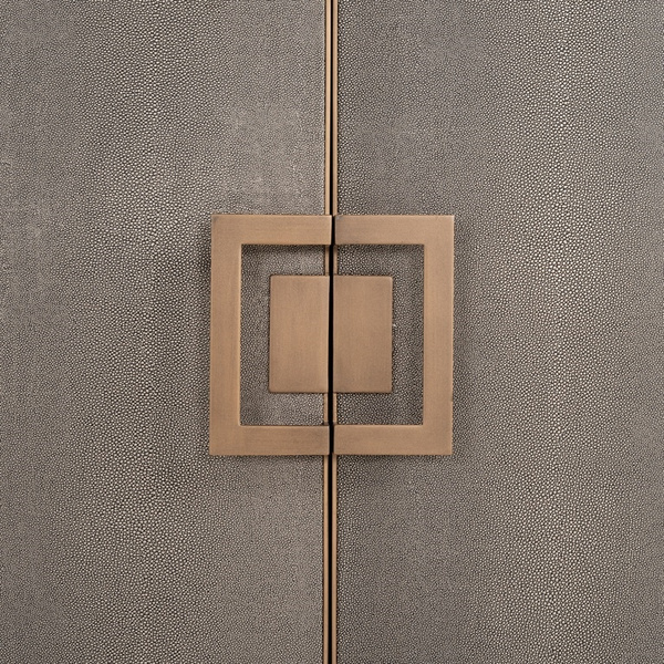 Ramy z dębu bejcowanego na czarno połączone z geometrycznie ukształtowanymi uchwytami w kolorze mosiądzu oraz drzwi starannie ozdobione repliką skóry shagreen.
