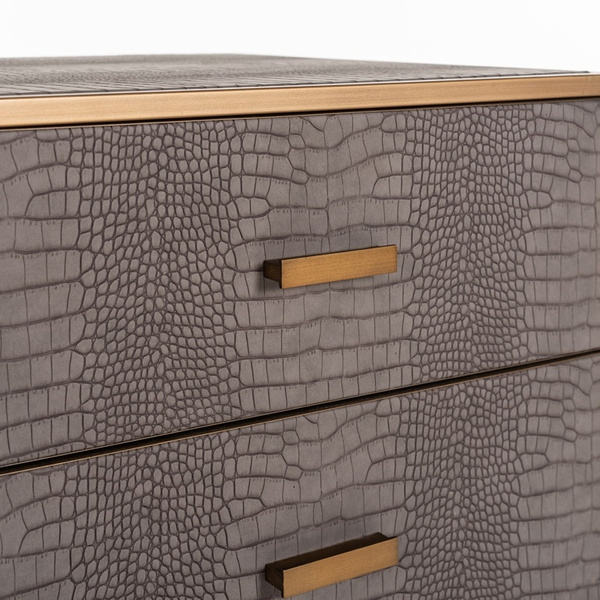 Charakteryzuje się precyzyjnym wykończeniem z teksturowanej sztucznej skóry shagreen oraz metalowymi elementami w odcieniu szczotkowanego złota.