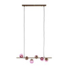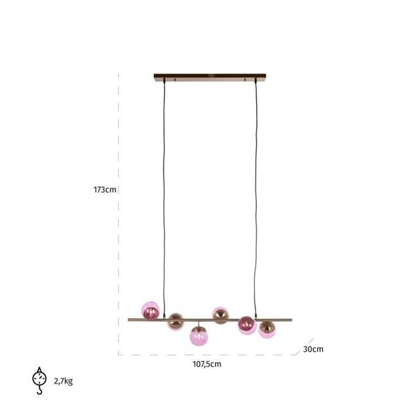 Zdobi ją 6 różowych szklanych kloszy zamocowanych na metalowym korpusie w szczotkowanym złotym kolorze.