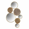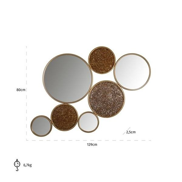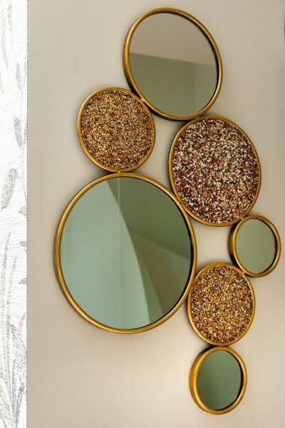 Cztery okrągłe lustra oprawione w eleganckie metalowe złote ramy o różnych rozmiarach zostały połączone z trzema okrągłymi błyszczącymi elementami wykonanymi z połyskującego kruszonego diamentu, tworząc przy tym piękny i dekoracyjny element.
