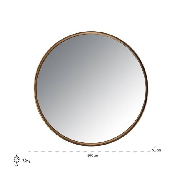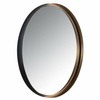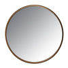 Zgrabne, okrągłe lustro obrobione w szykowną ramę wykonaną z blachy aluminiowej o wykończeniu w kolorze antycznego mosiądzu.