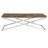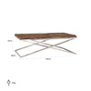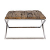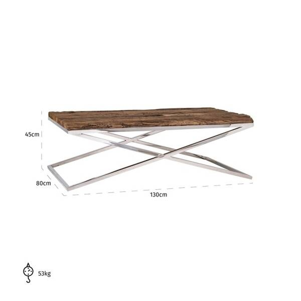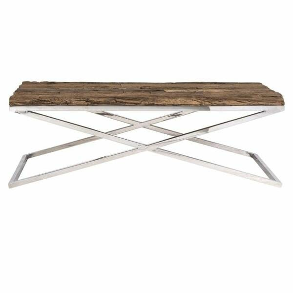 Ramy ze srebrnej, błyszczącej stali nierdzewnej w połączeniu z szorstkim drewnem z recyklingu nadają tym meblom szykowny, ale i wytrzymały wygląd.