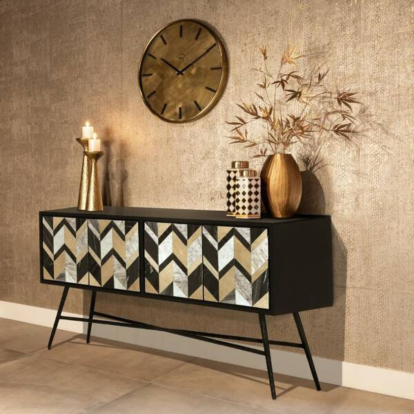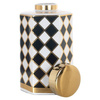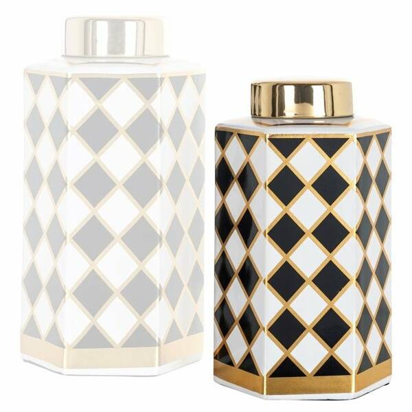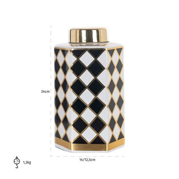 Ceramiczne wykonanie w czarno-białe geometryczne wzory z elementami w kolorze złota.