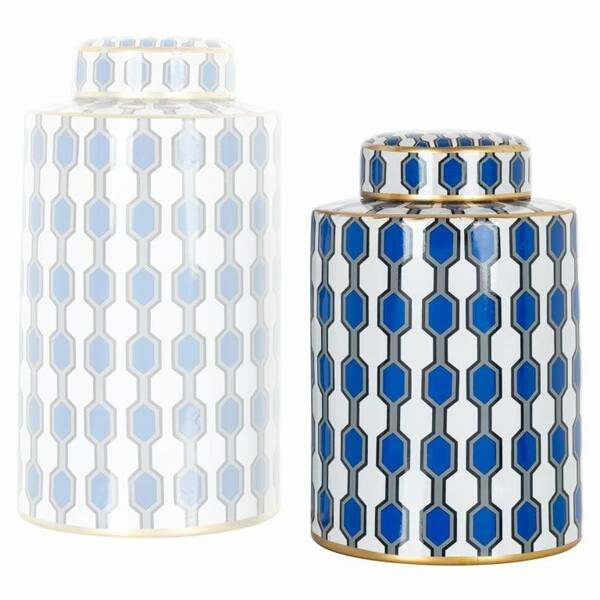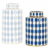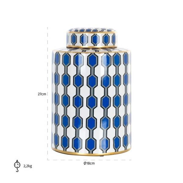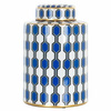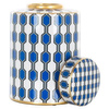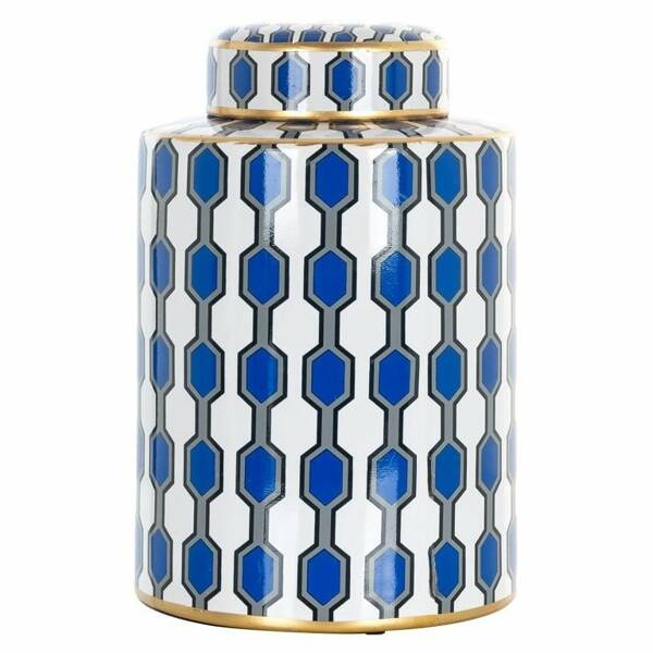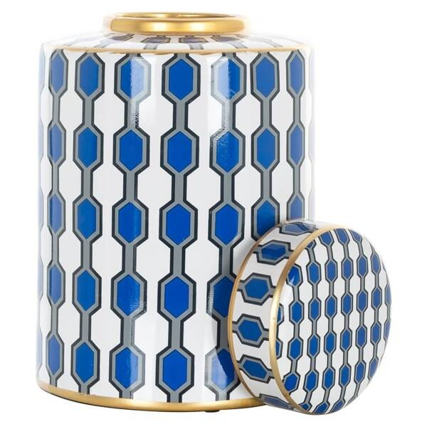 Ceramiczny pojemnik Janice został wzbogacony złotymi brzegami i niebieskimi wzorami.