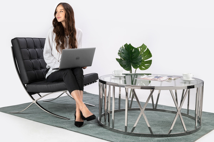 Z kolei stelaż i nóżki fotela zrobione są ze stali nierdzewnej polerowanej, co dodaje elegancji. Dodatkowo wewnątrz całego stelaża jest stalowy rdzeń który wzmacnia konstrukcję i zapewnia stabilność. Klasyczny i minimalistyczny styl powoduje, że mebel będzie pasował do dużej ilości wnętrz, w tym tych bardzo eleganckich, klasycznych, czy w stylu glamour. Polecamy fotel w zestawie z podnóżkiem z tej samej serii.