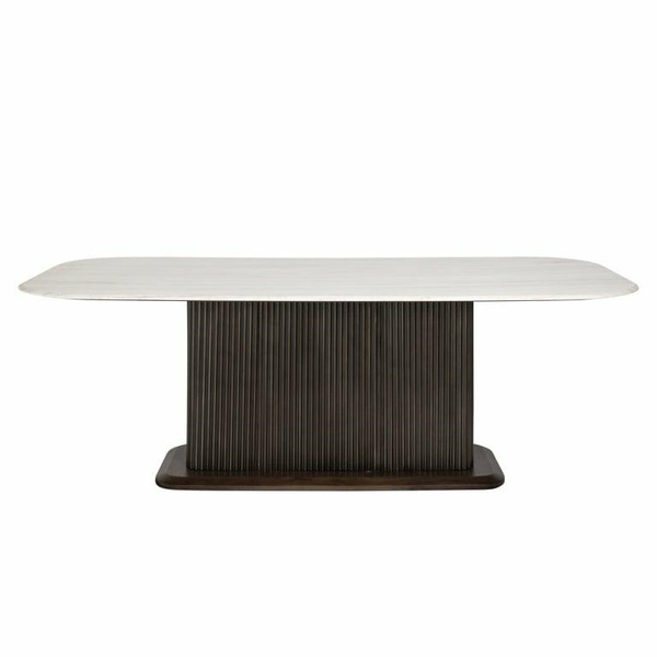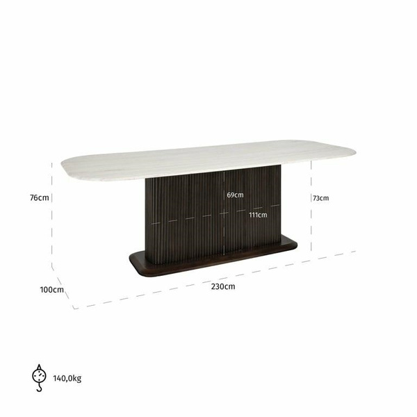 Piękny, owalny blat zdobi biały marmur, a szeroką podstawę drewniane lamele.