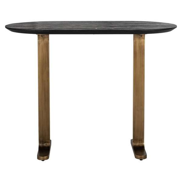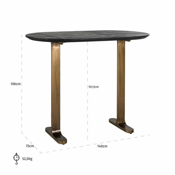 RICHMOND stolik barowy REVELIN 140. Kolekcja Ravelin to elegancja w klasycznym, ponadczasowym wykonaniu. Piękny, owalny blat wykonano z drewna Mango a mosiężną podstawę ze stali w kolorze matowego złota. Drewno Mango jest bardzo trwałym i wyjątkowym rodzajem drewna. Wszystko to tworzy niezwykle szykowną oraz luksusową kolekcję. Wymiary: wys. 106 cm / szer. 140 cm / gł. 75 cm Waga netto: 52 kg.