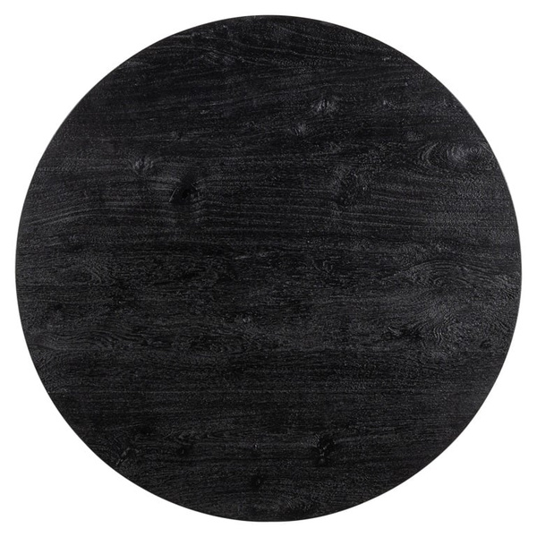Piękny, okągły blat wykonano z drewna Mango a mosiężną podstawę ze stali w kolorze matowego złota.