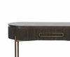 Owalny blat zdobi eleganckie drewno dębowe w połączeniu z miedzianymi elementami.