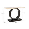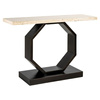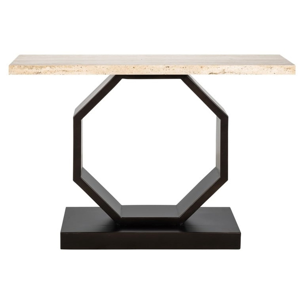 Piękny, prostokątny blat wykonano z kamienia Trawertyn a podstawę z ciemnobrązowego metalu.