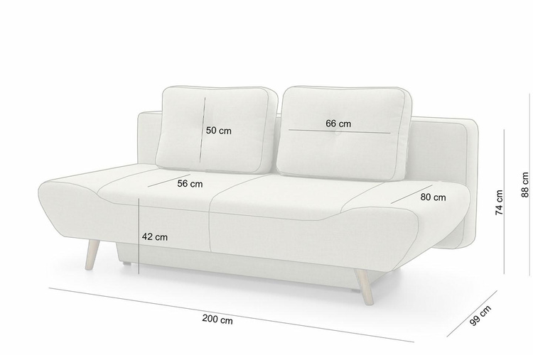 Sofa DORIAN z funkcją spania, Rozkładana sofa o ponadczasowym wyglądzie, która doskonale wpasuje się w każde wnętrze. Wyprodukowana w Polsce, posiada wbudowany pojemnik na pościel, co sprawia, że jest nie tylko stylowa, ale i funkcjonalna. Budowa z pianki PUR i sprężyny falistej oraz drewniana podstawa zapewnia solidność i wygodę użytkowania. Dzięki możliwości wyboru tkaniny obicia możesz dostosować sofę do swoich preferencji i wystroju pomieszczenia. Dodatkowo dwie duże poduchy sprawiają, że sofa będzie nie tylko wygodna do siedzenia, ale także idealna do relaksu oraz spania. Dorian to mebel, który zachwyci nie tylko swoim oryginalnym wyglądem, ale także jakością wykonania i praktycznością. Wymiary: wys. 88 cm / szer. 200 cm / gł. 99 cm Wysokość do krawędzi siedziska: 42 cm.