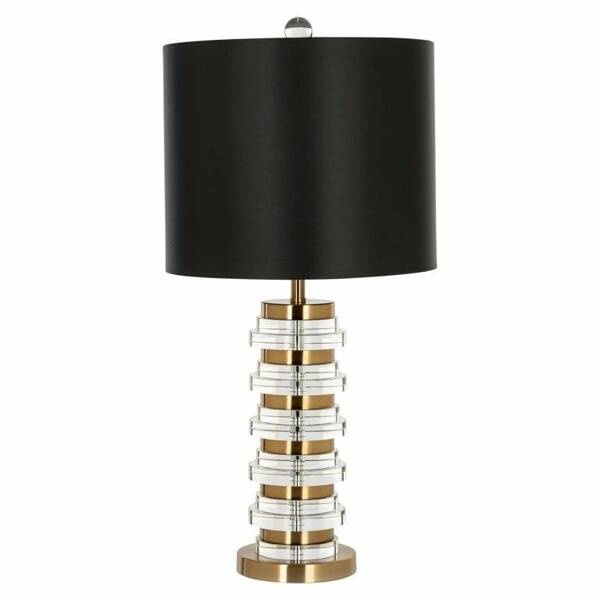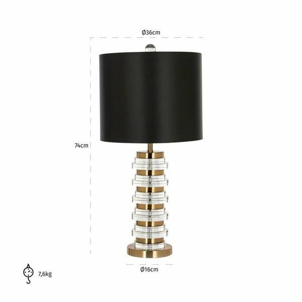 RICHMOND lampa stołowa LEONORE. Elegancki i nowoczesny element wystroju wnętrz. Czarny klosz w klasycznym stylu tworzy wspaniały kontrast z pięknie zdobioną, złotą podstawą przeplataną kryształowymi akcentami. Leonore polecamy do nowoczesnych aranżacji, jako element elegancji i wyrafinowania. Światło: E27 max. 60 W (brak w zestawie) Oprawa: wys. 74 cm / szer. 36 cm / gł. 36 cm Waga netto: 7,6 kg.