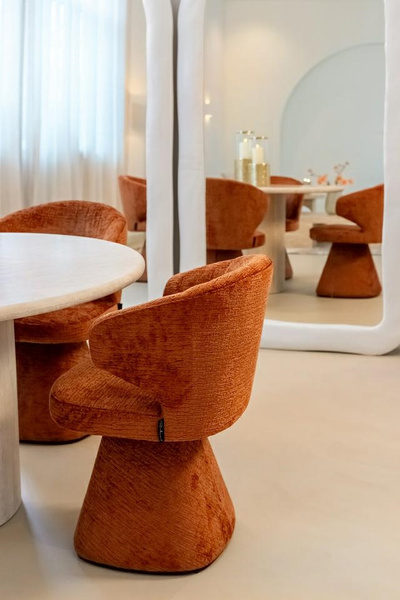 Kształtne oparcie, siedzisko oraz podstawę wykończono wyjątkową tkaniną o nazwie Fusion 126 Copper (100% poliester).