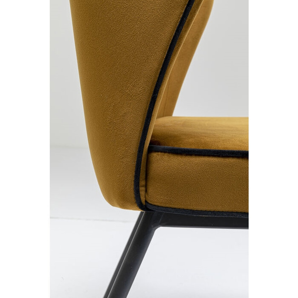 KARE krzesło IRINA. Niebywała elegancja i styl, która doskonale sprawdzi się w nie jednej jadalni. Wygodne siedzisko wykonano z aksamitnej musztardowej tkaniny poliestrowej i wzbogacono je czarnymi przeszyciami. Smukłe nóżki wykonano z czarnej stali i dodano im szykowne akcenty w złotym kolorze. Dostępne także krzesło barowe z kolekcji. Wymiary: wys. 83 cm / szer. 50 cm / gł. 57,5 cm Wysokość do krawędzi siedziska: 47 cm Waga: 7,1 kg.