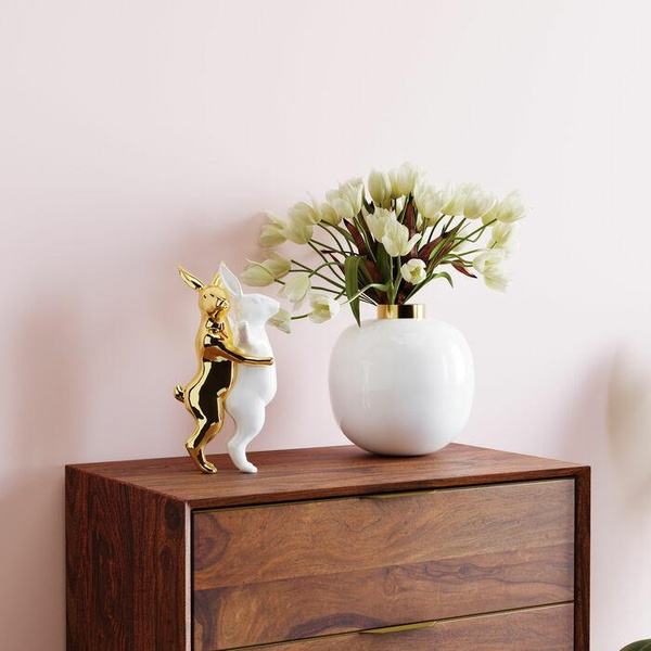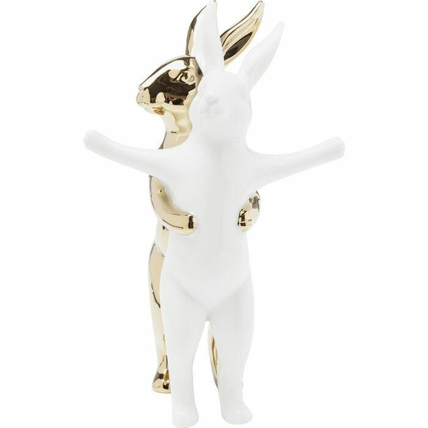 KARE figurka dekoracyjna HUGGING RABBITS. Oryginalna dekoracja, która wprowadzi do Twojego wnetrza wyjątkową, artystyczną atmosferę. Figurka ukazuje dwa przytulające się króliki, w nowoczesnej, zabawnej formie. Całość wykonano z kamionki glazurowanej w biało-złotej kolorystyce. Wymiary: wys. 24,5 cm / szer. 14,7 cm / gł. 11,5 cm Waga: 0,6 kg.