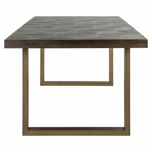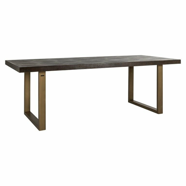 Prostokątny blat zdobi eleganckie drewno dębowe w połączeniu z solidną podstawą wykonaną ze sklejki oraz metalu w złotym odcieniu.