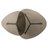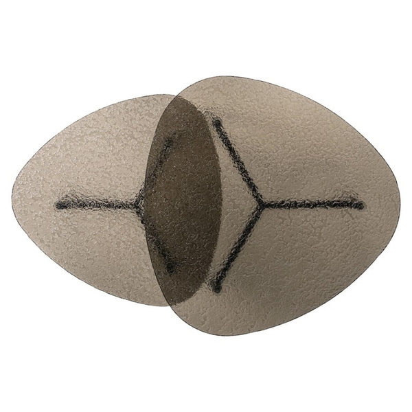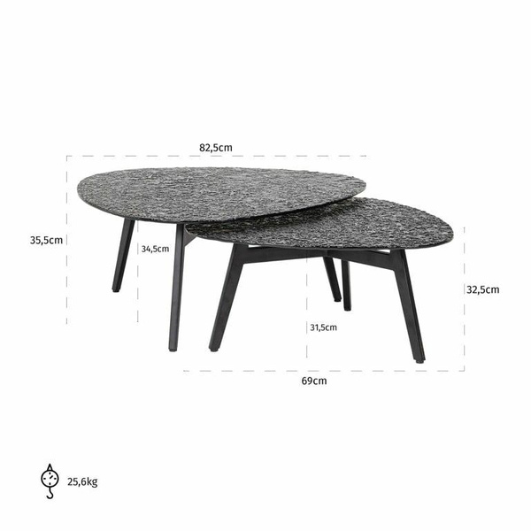 Dwa zaokrąglone blaty wykonane są ze szkła w kolorze czarnym/ dymionym, a podstawa z metalu.