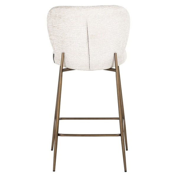 Dzięki smukłej sylwetce, metalowej podstawie z podnóżkiem w złotej kolorystyce i zgrabnemu beżowemu siedzisku.