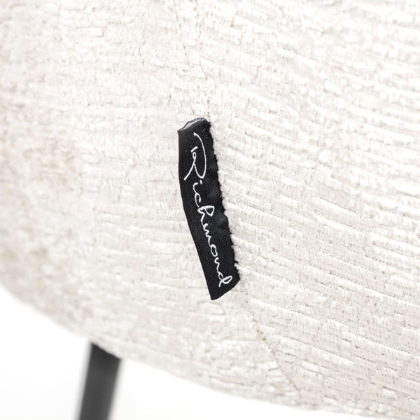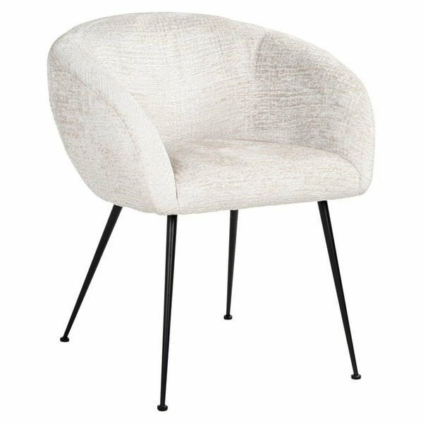 Wygodne siedzisko zostało obite jasną tkaniną i wyposażone w smukłe, metalowe nogi w kolorze czarnym.