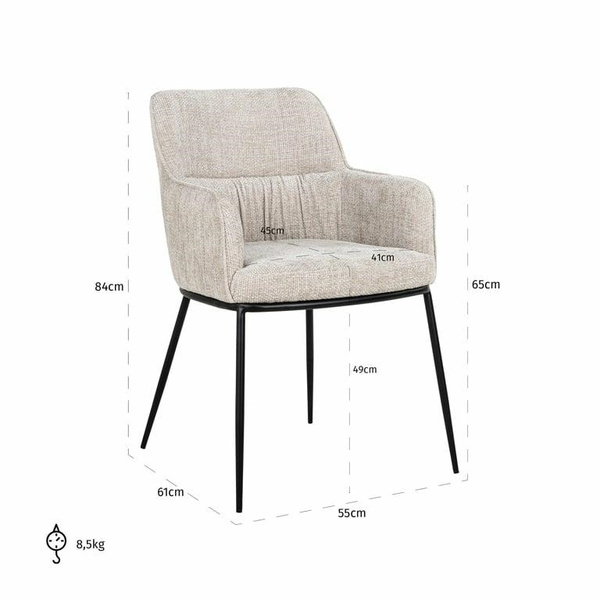 RICHMOND krzesło BELLA jasny beż. Przytulność i elegancja na pierwszym miejscu. Bella to krzesło, które ozdobi nie tylko domowe zacisze, ale również biuro. Piękna jasnobeżowa tkanina gwarantuje ponadczasowość, a wyższe oparcie i podłokietniki najwyższy komfort. Czarna metalowa podstawa dopełnia smukłą i lekką formę. Dostępna również ciemna wersja tkaniny. Wymiary: wys. 84 cm / szer. 55 cm / gł. 61 cm Waga brutto: 10,5 kg.
