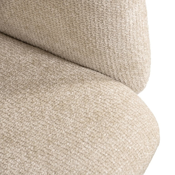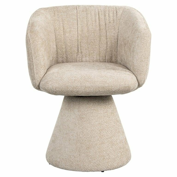 Kształtne oparcie, obrotowe siedzisko oraz podstawę wykończono jasną tkaniną beżową.