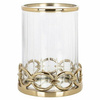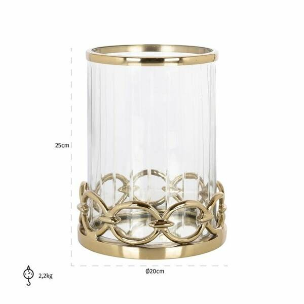 RICHMOND świecznik JAYCE złoty. Wyjątkowa ozdoba, która łączy w sobie elegancję szkła i złotego aluminium. Przezroczyste szkło subtelnie podkreśla światło świecy, a złote detale dodają luksusowego charakteru. Doskonale sprawdzi się jako dekoracja stołu czy komody, wprowadzając do wnętrza ciepło i wyrafinowanie. Jayce to idealny wybór dla osób ceniących sobie klasyczne dodatki z nutą nowoczesnego designu. Wymiary: wys. 24,5 cm / szer. 20 cm / gł. 20 cm Waga netto: 2,2 kg.