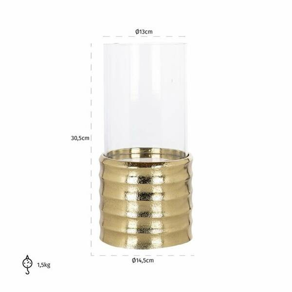 RICHMOND świecznik BODIL S złoty. Elegancka i wszechstronna ozdoba wykonana z aluminium i szkła, dostępna w dwóch rozmiarach. Falista, złota podstawa wprowadza luksusowy akcent do wnętrza, podczas gdy szklana osłona subtelnie rozprasza światło świecy, tworząc przytulną atmosferę. Dzięki swojej uniwersalności, Bodil doskonale sprawdzi się zarówno jako dekoracja stołu, jak i element wystroju na półce czy komodzie, dodając wnętrzom szyku i elegancji. Wymiary: wys. 30 cm / szer. 13 cm / gł. 13 cm Waga netto: 1,5 kg.
