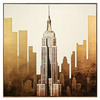 Imponująca kompozycja przedstawiająca panoramę miasta z centralnie umieszczonym wieżowcem, przypominającym Empire State Building.