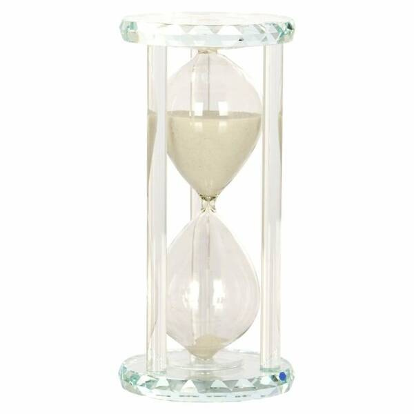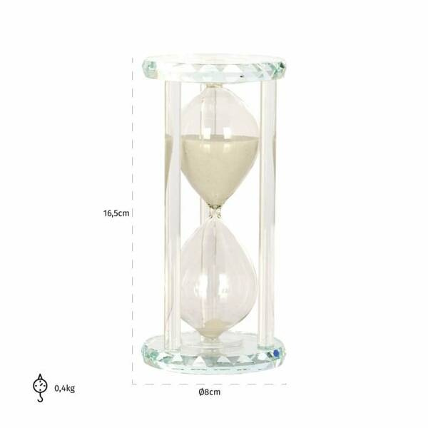 Jej konstrukcja opiera się na szklanej formie z eleganckim, przezroczystym wykończeniem, wzbogaconym o subtelny, biały piasek swobodnie przesypujący się pomiędzy bańkami. Metalowe elementy dodają stabilności i wytrzymałości, jednocześnie podkreślając wyrafinowany design.