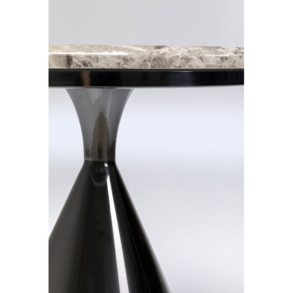 KARE stolik RITA 50 czarny. Nowoczesny, designerski stolik, który wyróżnia się unikalnym połączeniem eleganckiego wzornictwa i funkcjonalności. Okrągły blat został wykonany z marmuru syntetycznego, który nie tylko efektownie imituje kamień, ale także jest łatwy w pielęgnacji i odporny na uszkodzenia. Kolorystyka stołu łączy subtelny odcień szarości blatu z czarną, polerowaną podstawą w kształcie stożka, wykonaną z wysokiej jakości stali nierdzewnej. Kompaktowe wymiary stolika sprawiają, że doskonale nada się jako stolik nocny w sypialni, element dekoracyjny w salonie lub funkcjonalny mebel w przedpokoju. Maksymalna nośność wynosi 30 kg, co pozwala na bezpieczne przechowywanie ozdób czy drobnych przedmiotów codziennego użytku. Stolik Rita to idealny wybór dla osób ceniących sobie stylowe i trwałe rozwiązania w nowoczesnych wnętrzach. Wymiary: wys. 53 cm / szer. 50 cm / gł. 50 cm Blat: śr. 50 cm Waga brutto: 7,9 kg.