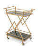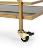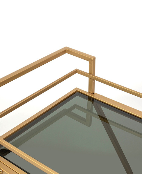 KARE barek PYRAMIDS złoty. Elegancki dodatek do każdego domu, który nadaje wnętrzom luksusowego charakteru. Wykonany z wysokiej jakości materiałów, takich jak stal lakierowana na złoty kolor oraz hartowane szkło w kolorze czarnym, stanowi wyrazisty element wyposażenia w stylu Art Deco. Dzięki praktycznym kółkom z blokadą, barek jest niezwykle funkcjonalny i elastyczny w użytkowaniu – można go łatwo przemieszczać i ustawiać w dowolnym miejscu. Dwa poziomy półek zapewniają przestrzeń do przechowywania akcesoriów barowych, kosmetyków w łazience, książek przy łóżku lub przyborów kuchennych. Jego wyjątkowy design sprawia, że przyciąga uwagę gości i podnosi estetykę wnętrza. Idealny do serwowania koktajli, przechowywania eleganckich naczyń lub jako nietuzinkowy stolik pomocniczy. Wymiary: wys. 79 cm / szer. 65 cm / gł. 35,5 cm Waga: 8,83 kg.