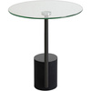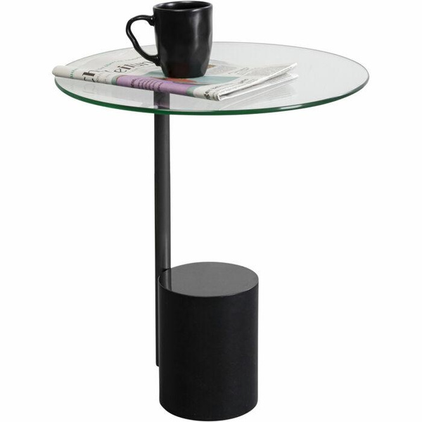 Blat wykonany z przezroczystego szkła o grubości 8 mm nadaje konstrukcji lekkości, podczas gdy solidna, cylindryczna podstawa z marmuru zapewnia stabilność i trwałość. Smukła stalowa rama w czarnym kolorze, dodaje całości nowoczesnego charakteru.