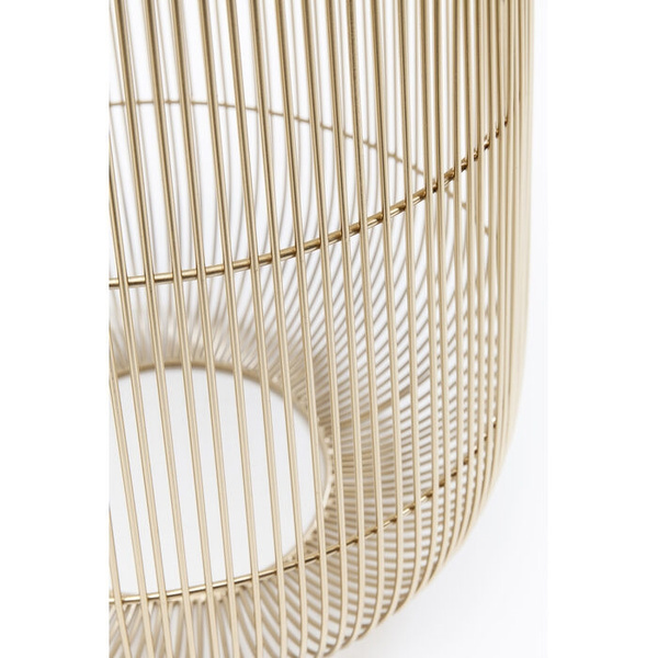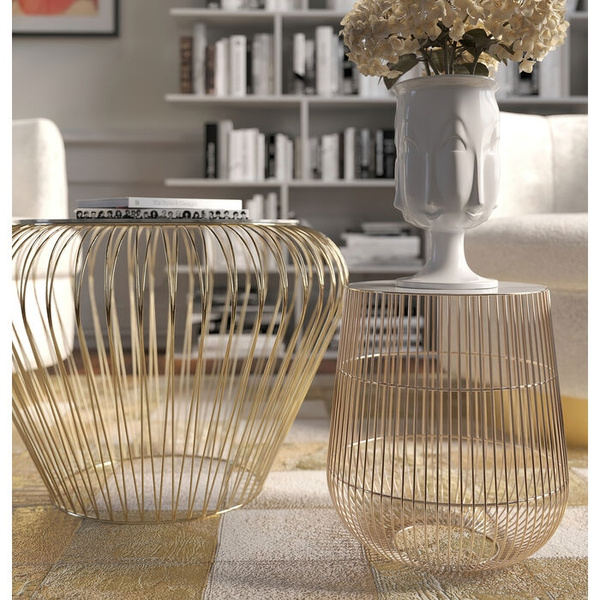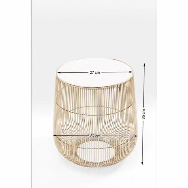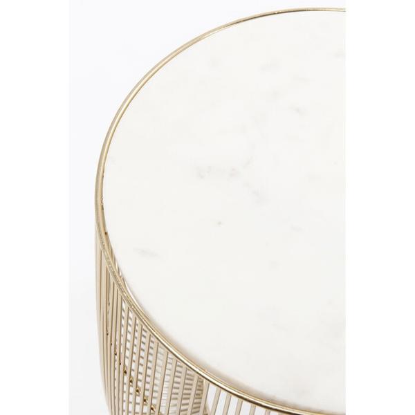 Złota podstawa wykonana z filigranowych prętów harmonijnie łączy się z okrągłym marmurowym blatem w białym kolorze, tworząc stylowy i praktyczny dodatek do każdego wnętrza. Połączenie naturalnego marmuru i mosiądzowanej stali nadaje stolikowi elegancki, wyrafinowany wygląd.