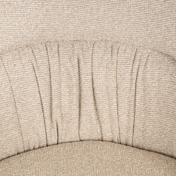 Tapicerka w jasnobeżowym odcieniu, wykonana z wysokiej jakości poliestru, zapewnia miękkość i trwałość, a delikatne marszczenia na oparciu dodają subtelnej estetyki.
