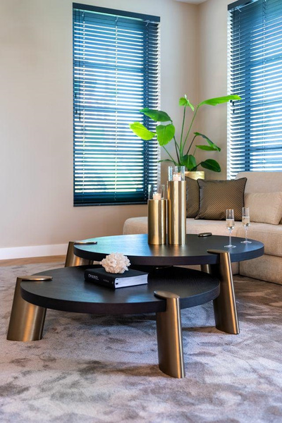 RICHMOND zestaw stolików kawowych BRODY. Szykowny zestaw dwóch stolików, które wyróżniają się nowoczesnym designem i wysoką jakością wykonania. Blaty wykonane są z forniru dębowego w kolorze węgla drzewnego, co nadaje im stylowy i luksusowy wygląd. Konstrukcja oparta na solidnych, stalowych nogach w odcieniu antycznego złota zapewnia stabilność i wyrafinowany charakter. Nietypowe osadzenie podstawy, częściowo nachodzącej na blat, dodaje stolikom designerskiego uroku i oryginalności. Dzięki kompaktowym wymiarom zestaw sprawdzi się zarówno w dużych, jak i mniejszych przestrzeniach. To doskonały wybór dla osób ceniących nowoczesny, a zarazem elegancki wystrój wnętrz. Wymiary: wys. 42 cm / szer. 122 cm / gł. 122 cm Waga brutto: 76,5 kg.