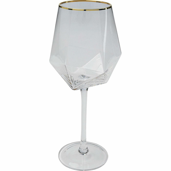 KARE komplet kieliszków do wina DIAMOND RIM 525 ml. Elegancki i nowoczesny dodatek do każdej jadalni lub kuchni. Wykonany z przezroczystego szkła, posiada geometryczny kształt z fasetowanymi krawędziami, które nadają wyjątkowego charakteru. Górna krawędź ozdobiona jest subtelnym złotym wykończeniem, co dodaje luksusowego wyglądu. Ręcznie wykonany kieliszek ma pojemność 525 ml, co pozwala cieszyć się ulubionym winem w pełni. Ze względu na delikatne zdobienia nie nadaje się do mycia w zmywarce, co podkreśla jego unikalność i ręczne wykonanie. Produkt jest częścią większej serii, dzięki czemu można skompletować zestaw pasujących szklanek i kieliszków do eleganckiego nakrycia stołu. Zestaw zawiera 4 sztuki produktu. *W kieliszku mogą wystąpić pęcherzyki powietrza, które są naturalnym efektem powstałym podczas ręcznej obróbki szkła. Wymiary 1 szt: wys. 24,5 cm / szer. 7,5 cm / gł. 7 cm Waga: 0,2 kg Sposób wysyłki: Paczka.