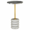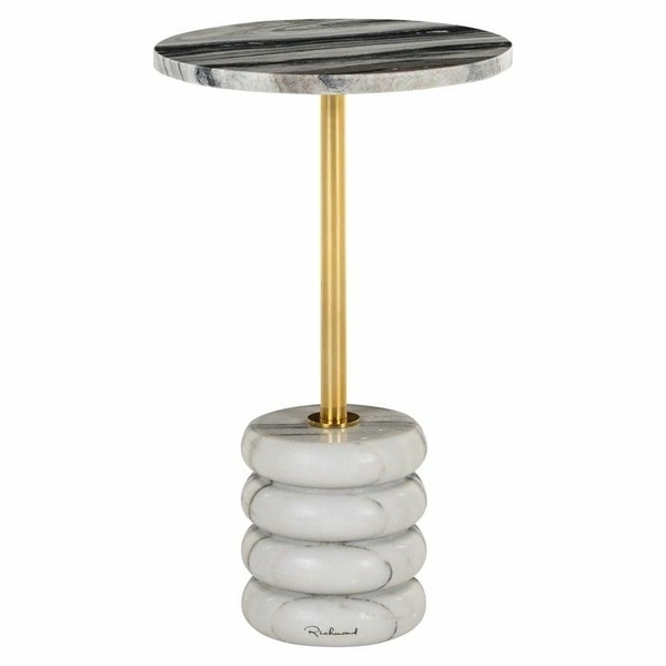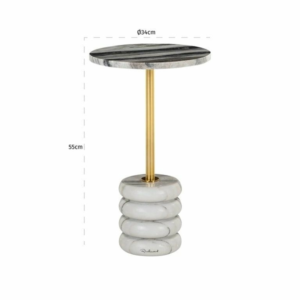 RICHMOND stolik ISOLDE. Elegancki i nowoczesny stolik, który łączy w sobie luksusowy design i funkcjonalność. Wykonany z połączenia aluminium i marmuru, wyróżnia się solidną konstrukcją i unikalnym wyglądem. Okrągły blat o grubości 1,5 cm cechuje efektowny, naturalny wzór marmuru w odcieniach bieli, czerni i szarości. Podstawa stolika składa się z kilku zaokrąglonych elementów marmurowych, co nadaje mu charakterystyczną formę. Smukła, złota noga dodaje elegancji i kontrastuje z ciężką marmurową podstawą. Dzięki swoim kompaktowym wymiarom, stolik Isolde sprawdzi się zarówno jako stolik boczny, jak i dekoracyjny element wnętrza. Wymiary: wys. 55 cm / szer. 34 cm / gł. 34 cm Waga brutto: 19,3 kg.