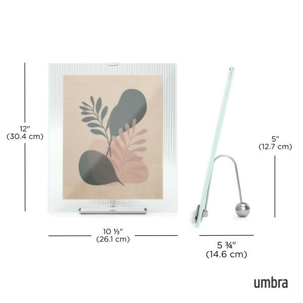 UMBRA ramka na zdjęcia FLUTE 8x10 srebrna. Elegancki i nowoczesny akcent do każdego wnętrza. Unikalna sztalugowa konstrukcja nie tylko przyciąga wzrok, ale także pozwala efektownie wyeksponować zdjęcia w formatach 4x6, 5x7 lub 8x10. Szklany podkład z subtelną fakturą dodaje całości lekkości i wyrafinowanego stylu. Dzięki możliwości ustawienia w pionie lub poziomie z łatwością dopasujesz ramkę Flute do swoich ulubionych kadrów. Każdy metalowy element został ręcznie polerowany, co czyni każdy produkt wyjątkowym. Wymiary: wys. 31 cm / szer. 26 cm / gł. 4 cm Waga netto: 1,5 kg.