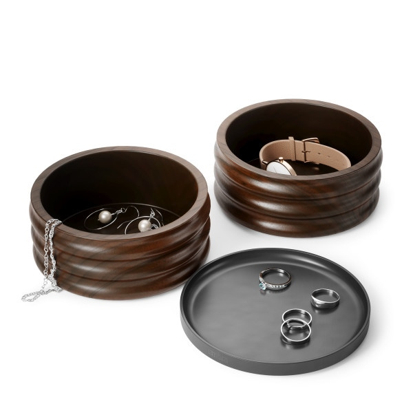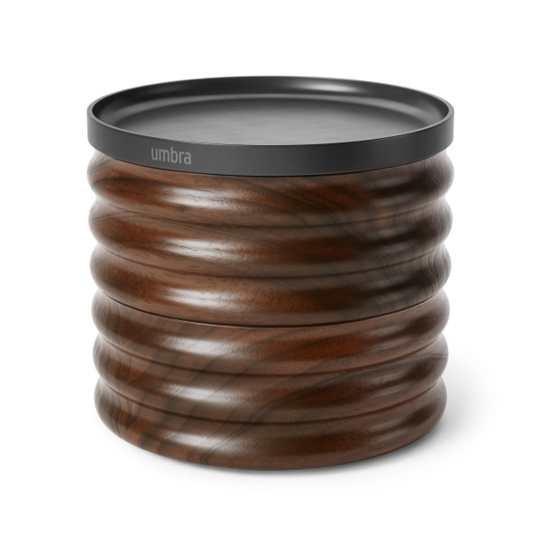 UMBRA organizer na biżuterię TESORA czarny / brązowy Stylowe i funkcjonalne rozwiązanie do przechowywania akcesoriów. Dzięki dwupoziomowej konstrukcji można je dowolnie układać w stos lub rozdzielać, dostosowując do indywidualnych potrzeb. Platerowana metalowa pokrywa pełni dodatkową funkcję – może służyć jako elegancka taca do eksponowania najczęściej noszonych ozdób. Kompaktowy rozmiar sprawia, że pudełko świetnie sprawdzi się na stoliku nocnym lub toaletce. Wykonane z naturalnego drewna, wyróżnia się unikalnym usłojeniem i fakturą, co czyni każdy egzemplarz niepowtarzalnym. Aby zachować jego piękno, wystarczy przecierać je czystą, wilgotną ściereczką. Wymiary: wys. 13 cm / szer. 13 cm / gł. 12 cm Waga brutto: 0.53 kg.