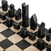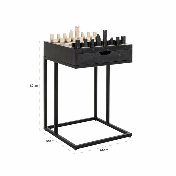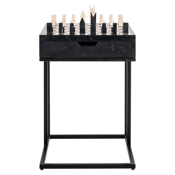 Precyzyjne linie szachownicy i geometryczne figury przyciągają wzrok, a wysuwana szuflada ukrywa miejsce na przechowywanie pionków.