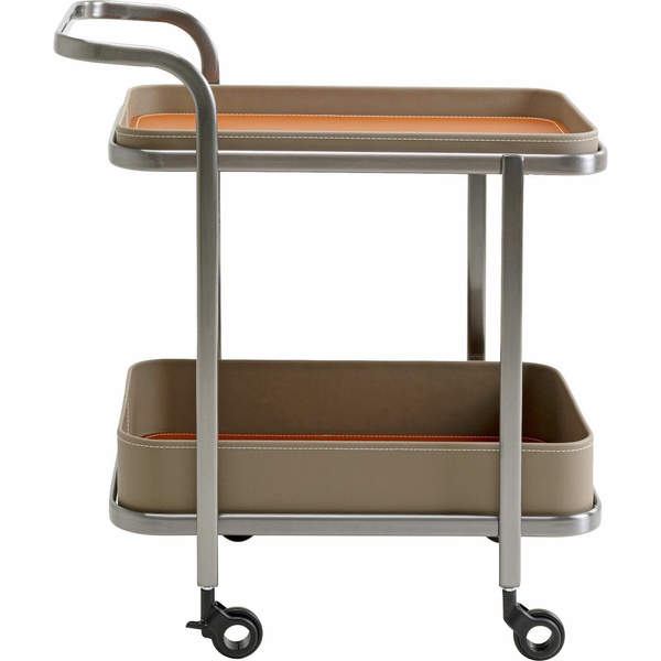 KARE barek TANGO. Elegancki i funkcjonalny wózek na kółkach, który doskonale odnajdzie się w nowoczesnych wnętrzach. Konstrukcja wykonana jest z solidnej, szczotkowanej stali nierdzewnej w kolorze srebrnym, co gwarantuje trwałość i stabilność. Półki wykończono lakierowaną stalą i pokryto tekstylną tkaniną z poliuretanowym wykończeniem, w kolorze beżowym z pomarańczowymi akcentami i dekoracyjnymi, białymi przeszyciami. Wózek posiada dwa poziomy i poręczny uchwyt, co ułatwia jego prowadzenie i organizację przestrzeni. Obrotowe kółka zapewniają mobilność, a maksymalna nośność wynosi 30 kg. Barek świetnie sprawdzi się jako stylowy pomocnik w salonie, kuchni lub łazience. Wymiary: wys. 57 cm / szer. 40 cm / gł. 66 cm Waga brutto: 15 kg.