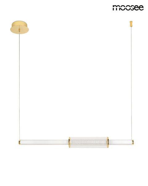 MOOSEE lampa wisząca LIBRA złota. Wykonana z połączenia metalu i szkła, harmonijnie łącząc styl i wytrzymałość. Nadaje wyjątkowy charakter eleganckim biurom, stylowym jadalniom i prestiżowym restauracjom. Świetnie komponuje się z wnętrzami w stylu glamour, nowoczesnym, art déco oraz modern classic. Można ją zawiesić zarówno pionowo, jak i poziomo, co pozwala dopasować jej układ do indywidualnych potrzeb i charakteru wnętrza. Odkryj całą serię Libra i znajdź model, który najlepiej pasuje do Twojej przestrzeni. Światło: LED 43 W / 3440 lm / 3000 K Oprawa: wys. 8,5 - 10 cm / szer. 85 cm / gł 8,5 - 10 cm Mocowanie: śr. 10 cm / wys. 5 cm Przewód: 210 cm Waga netto: 2,4 kg Wymiary opakowania: 92,5 cm / 15 cm / 21 cm.