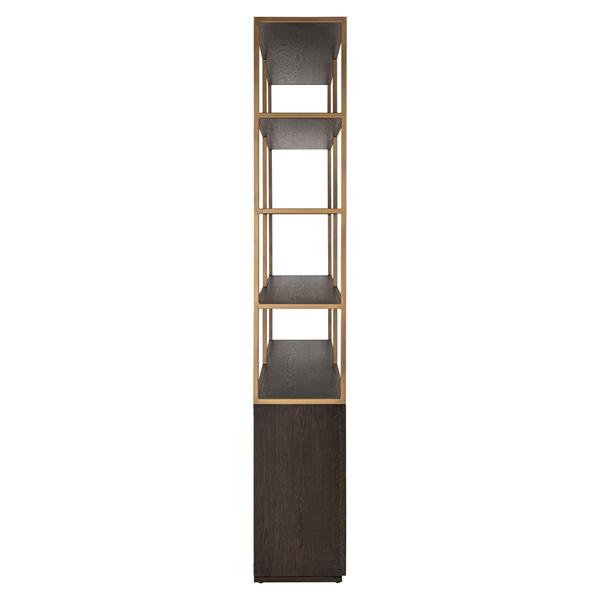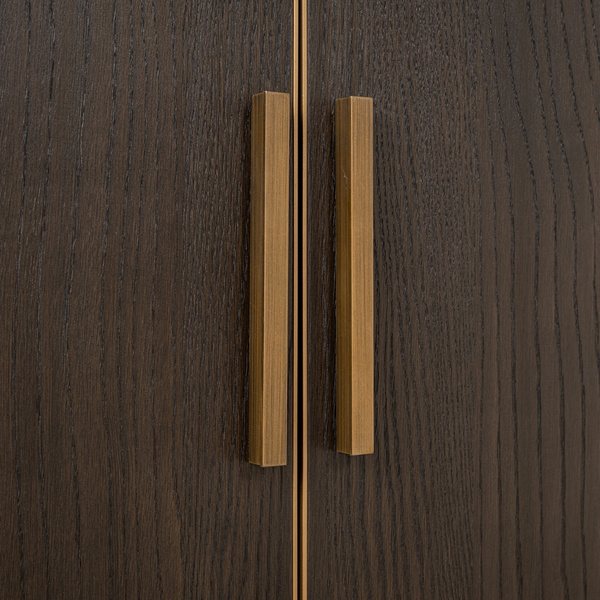 Konstrukcja oparta jest na połączeniu metalu oraz ciemnego drewna dębowego, uzupełnionego o fornir, co nadaje całości wyrafinowany, luksusowy charakter.